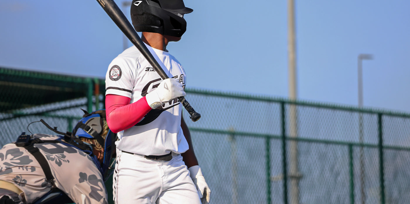FULL LENGTH SOCKS Baseball player in action on a field with advertisements in the background